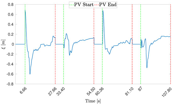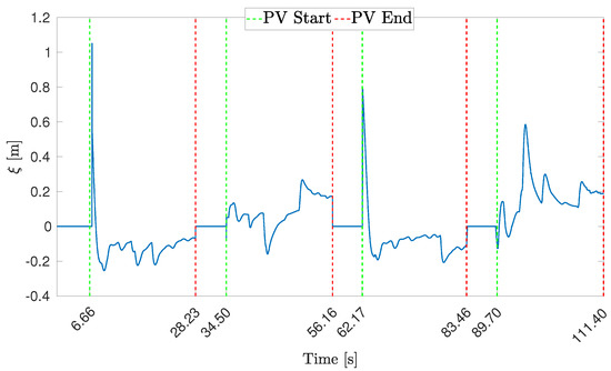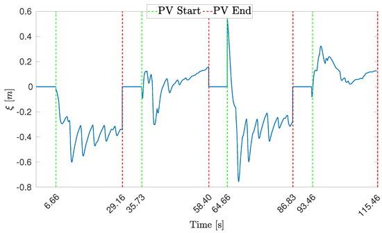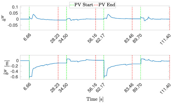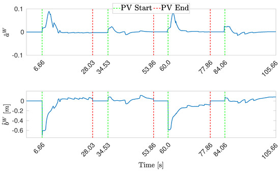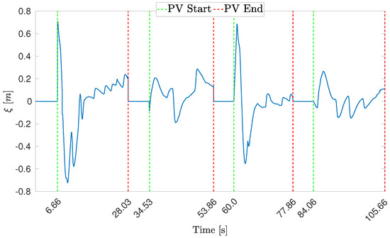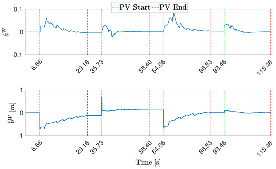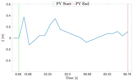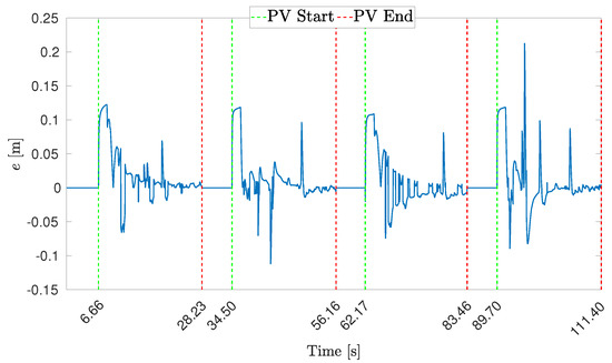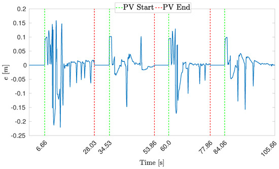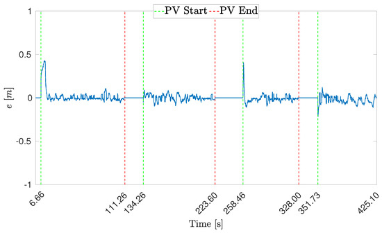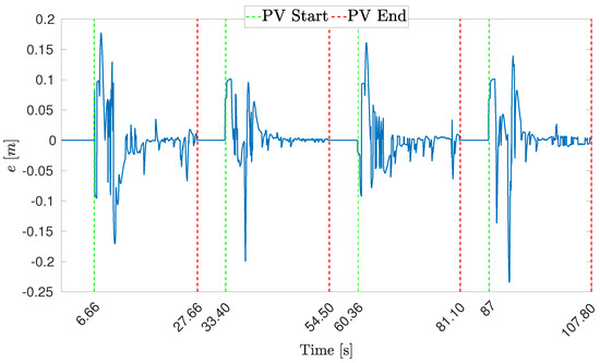 In Figure 23, the projection on the xy−plane of the UAV path is shown. After take-off, the UAV was manually guided to the first waypoint: in this phase, the control error e and the navigation error are not computed, which explains why they are constantly zero in Figure 24, Figure 25, Figure 26, Figure 27, Figure 28, Figure 29, Figure 30, Figure 31 and Figure 32. Next, the UAV started collecting observations to estimate the parameters and of the PV midline. Because the UAV does not move until the estimation error is below a given threshold at the PV start of each row, the duration of this phase may vary in different experiments or when tracking different PV rows within the same experiment. The average control error and the RMSE associated with the navigation trajectory are computed only after the UAV has reached the speed of 1 m/s after a transit (i.e., the sometimes significant errors at the start of PV rows are not considered).