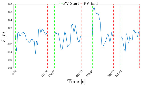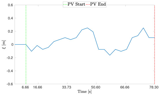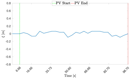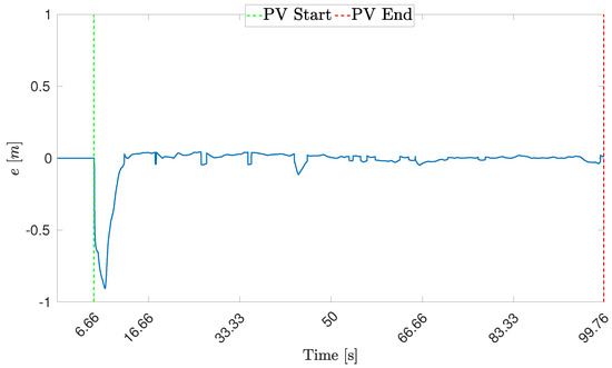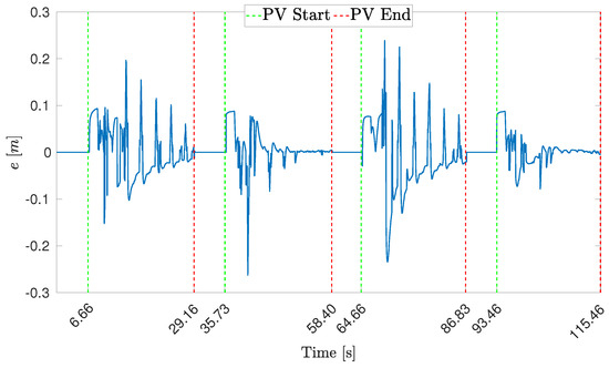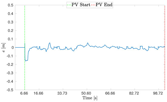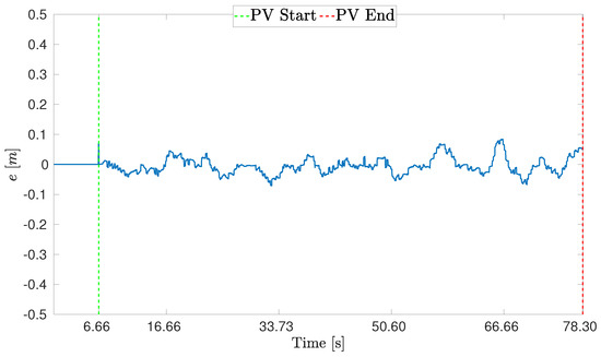 The same test was performed with both the thermal and RGB cameras for PV midline estimation and navigation. Once again, the UAV path is not reported, as it would be challenging to appreciate differences from the previous tests. In Figure 28, the control error e is shown, with m and m. In Figure 29, navigation error is shown, with an RMSE of m. The average navigation error is lower than in the previous cases, as is also visible in the figure.