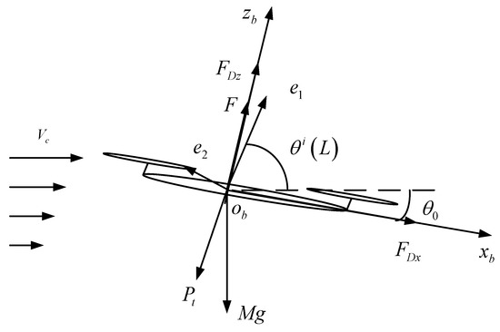 Where is the body coordinate system in the plane of the UAV, is the horizontal wind speed, is the total lift of the UAV, is the inclination between and the horizontal direction, is the included angle between and the horizontal direction, is the gravity of the UAV, is the total tension of the mooring cable to the tethered UAVs, and and are the aerodynamic force received by the UAV in and directions, respectively. The expressions are: