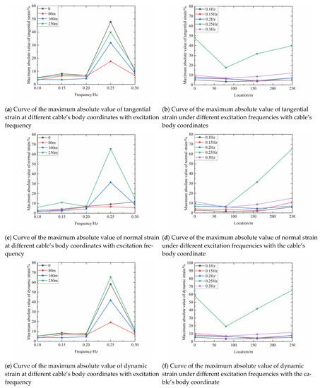 Taking condition 1.1 as an example, the excitation amplitude Ae = 2 m and the excitation frequency = 0.1 Hz, 0.15 Hz, 0.2 Hz, 0.25 Hz, 0.3 Hz. The relationship between the maximum absolute value of the tangential, normal, and dynamic strain with frequency and the cable’s body coordinates is shown in Figure 4.