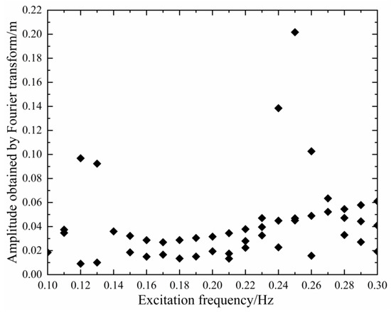 In order to analyze the anomalies appearing at the excitation frequency of 0.25 Hz, the excitation frequency change interval is shortened to 0.1 Hz, and the top dynamic strain time course curve is subjected to spectral analysis with a sampling frequency of 30 Hz and 2048 sampling points. The number and magnitude of the amplitudes obtained from the spectrum analysis are as shown in Figure 5, and the frequency spectrum curves according to different excitation frequencies are as shown in Figure 6.