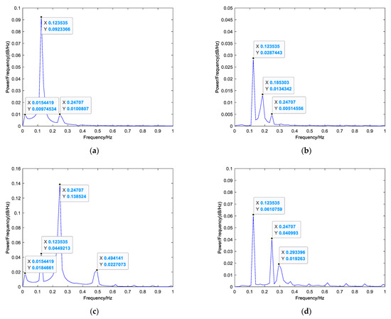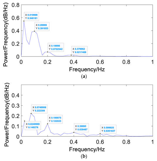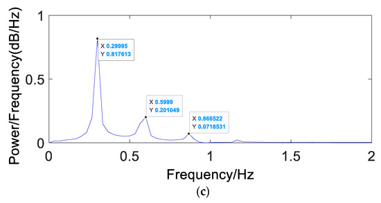 When the tethered UAV hovers, the structure is similar to the cable-stayed bridge [20]. It can be approximated that the natural frequency of the tethered UAVs in the hovering state is . This equation is substituted by the parameters of working condition 1.1; the first natural frequency of the hovering tethered UAVs is predicted to be about 0.1235 Hz. Figure 4 shows that a rich dynamics phenomenon emerges when the excitation frequency crosses the first and second natural frequencies. Figure 5a shows that when the excitation frequency approaches the first natural frequency, the amplitude jumps from the single-periodic component to the multi-periodic component, and subharmonic responses, the multiply periodic response, and subharmonic response appear. Subsequently, the excitation frequency moves away from the intrinsic frequency, and in the response of Figure 5b, it can be seen that in addition to the components of the excitation frequency, there are also components of the first and second natural frequencies, and the subharmonic response disappears. The amplitude jumps again when the excitation frequency is close to the second natural frequency, and the multiplicative periodic and subharmonic responses appear. When the excitation frequency is far from the second natural frequency, the first and second natural frequencies and the excitation frequency components exist in addition to the excitation frequency, and the multiply periodic response disappears. In order to avoid the amplitude jump phenomenon, the first natural frequency of the tethered UAVs must be made as large as possible by changing the relevant parameters, such as the length of the tethered cable and the tension provided at the tip, thus avoiding the excitation frequency close to the natural frequency.