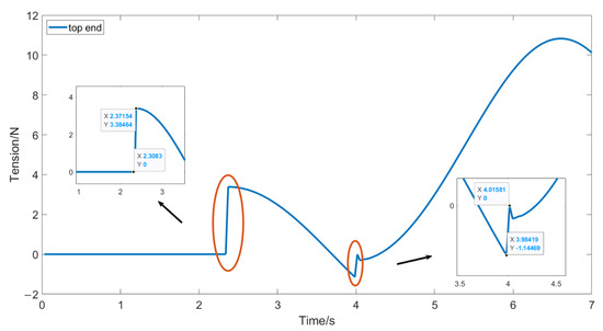 Figure 7 shows the curve of dynamic tension of the top with time in the first few seconds. The time of 0 s is the first time that the bottom of the tethered UAV is excited. It can be seen that in the first few seconds, there are two sudden changes in the top dynamic tension. The first is because the longitudinal wave generated by the bottom excitation reaches the top, and the second is because the transverse wave reaches the top. Because of the existence of the transverse wave, the shape of the cable is changed, resulting in sudden changes in the dynamic tension. In the second change, the dynamic tension increases rapidly, then decreases, and then the top dynamic tension is affected by both transverse and longitudinal waves.