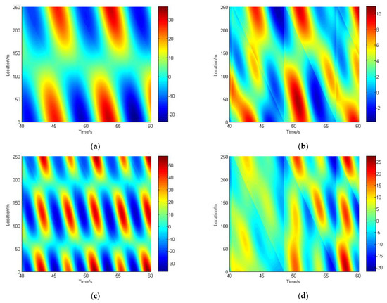 Temporal and spatial distribution of dynamic cable tension (Unit: N) under different excitation frequencies: (a) = 0.13 Hz, Ae = 2 m; (b) = 0.18 Hz, Ae = 2 m; (c) = 0.24 Hz, Ae = 2 m; (d) = 0.30 Hz, Ae = 2 m.