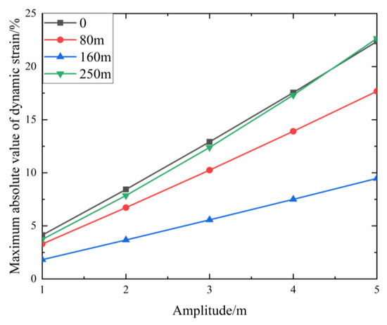 It can be seen from Figure 9 that under the same excitation frequency, with the increase in excitation amplitude, the maximum absolute value of dynamic strain at each point of the tethered cable gradually increases.