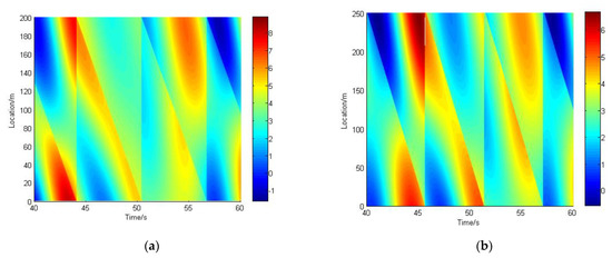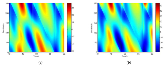Temporal and spatial distribution of dynamic cable tension (Unit: N) under excitation frequency = 0.19 Hz and excitation amplitude Ae = 2 m: (a) working condition 1.4; (b) working conditions 1.5.