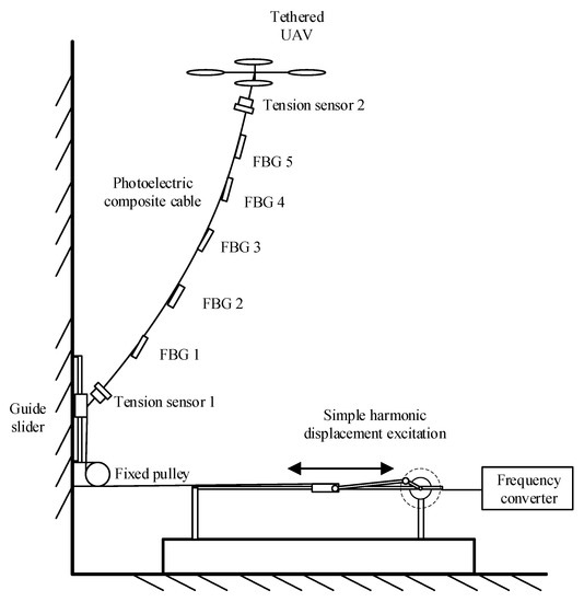 As shown in Figure 12, a simplified model is designed to study the influence of the frequency of periodic displacement excitation of the mooring point on the tension in the tethered UAVs. The frequency converter applies vertical harmonic displacement excitation at the lower end of the cable through the fixed pulley, the upper and lower tension sensors measure the tension at the end of the mooring line, and five FBG sensors are used to measure the strain at all parts of the cable. The UAV platform keeps hovering, and the cable keeps a small curvature. Because it is difficult to meet all the scale conditions, it is mainly to ensure that the material parameters of the prototype and model cable are the same. Model and prototype physical parameters of the tethered UAVs and cables are shown in Table 4, and an experimental diagram of the tethered UAVs model is shown in Figure 13.