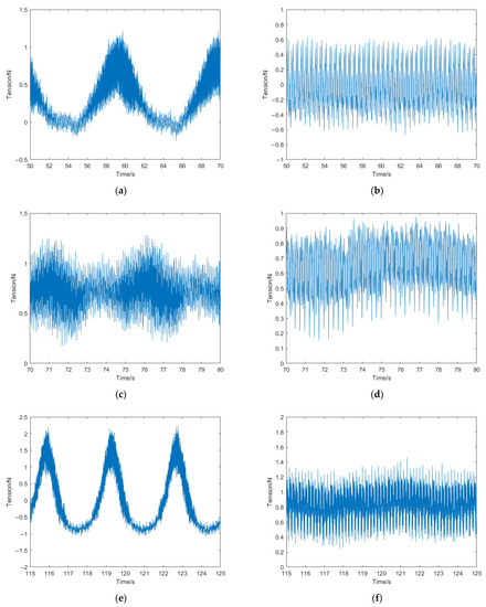 The curve of the dynamic tension of cable at the bottom and top of the tethered UAV. (a) bottom, = 0.1 Hz, Ae = 0.1 m; (b) top, = 0.1 Hz, Ae = 0.1 m; (c) bottom, = 0.2 Hz, Ae = 0.1 m; (d) top, = 0.2 Hz, Ae = 0.1 m; (e) bottom, = 0.3 Hz, Ae = 0.1 m; (f) top, = 0.3 Hz, Ae = 0.1 m.