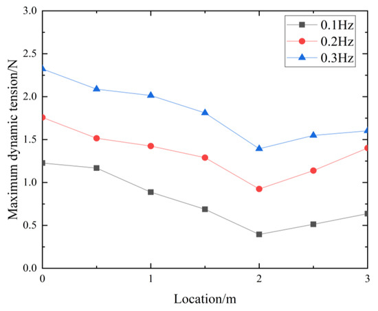 The distribution of maximum dynamic tension of tethered UAVs along with different cable positions under different excitation frequencies is shown in Figure 15.