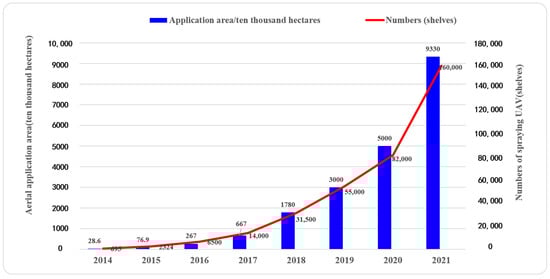 In 2014, multi-rotor-based plant protection drones began to appear in China. Owing to the simple and stable structure and low development costs, multi-rotor plant protection drones have found wide-spread application in China. The number of units increased from more than 4000 in 2016 to 160,000 in 2021, and the operating area increased from 6.67 million hectares in 2017 to 93.3 million hectares in 2021 [1]. According to the statistics of the Civil Aviation Administration of China, there were a total of 832,000 registered UAVs in the whole industry in 2021, including 160,000 plant protection UAVs accounting for 19.2% of all registered UAVs. The overall growth rate of the industry is 80%. In the next 2 to 3 years, China’s plant protection UAV market is expected to maintain a growth rate of more than 50–60%, while plant-protection UAV ownership is expected to reach 250,000 units and the operating area to reach 133 million hectares or more. As is shown in Figure 1, the number and application area of plant protection UAVs in China in recent 8 years have increased dramatically.