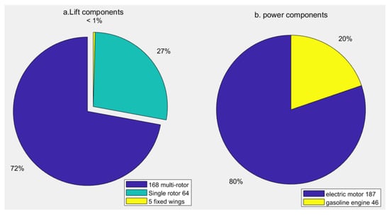 There are approximately 233 types of plant protection UAV types in China [3], including 64 single-rotor types, accounting for approximately 27%; 168 multi-rotor types, accounting for approximately 72%; and 5 fixed-wing types, accounting for approximately 1% of plant protection UAVs (Figure 3a); the gas-powered type accounts for approximately 20% and the battery-powered type accounts for approximately 80% (Figure 3b) [4]. The above data show that the plant protection UAVs in China are mainly battery-powered multi-rotor aircrafts. In the fierce market competition of hundreds of enterprises, DJI Innovation and XAG together occupy nearly 80% of plant protection UAVs in the Chinese market. Since electric multi-rotor UAVs have significant advantages in operation, maintenance, and training, it is expected that plant protection UAVs in China will continue to be dominated by electric multi-rotor UAVs in the next few years.