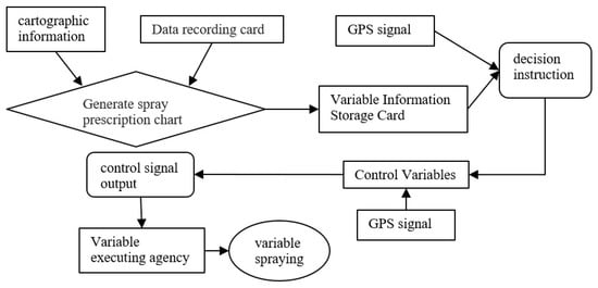 Prescription-based variable spraying-control technology is a control system that guides the variable spraying actuator to complete the variable spraying operation based on differing information on the distribution of farmland pests and weeds. The meaning of prescription application is usually multifaceted, including variable spraying prescription, operation path prescription, spraying target prescription, etc. The workflow of variable spraying system based on prescription diagram is shown in Figure 4.