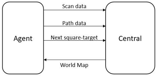 The system is described as a surveillance system with decentralized decision-making capabilities and a central entity acting as a single point of truth. Each agent runs the same code separately and can make its individual decisions. Before each decision is made the agent asks from the central entity to provide him with information about the map/world. That information is gathered in the central entity as each agent sends the data that he is collecting. For every agent an identification number, unique in the swarm, is allocated. Figure 3 shows the main data exchange between the agents and the central entity.