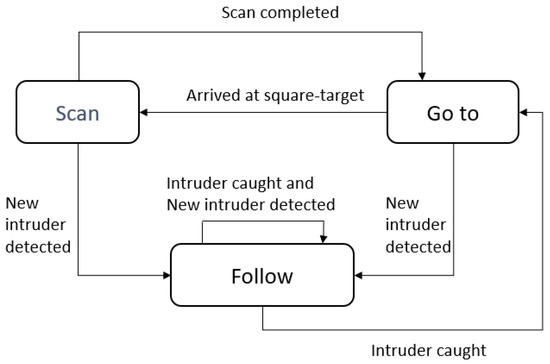 - Scan: “Scan” mode is activated when the agent is in the boundaries of its square-target. The agent delineates a zig-zag coverage pattern to surveille the whole square-target and check for intruders in that square. If an intruder is detected, then the agent will transit to “Follow intruder” mode. The algorithm used is described in detail in Section 3.4.