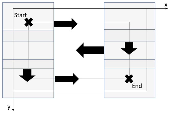 The agent moves in the boundaries of the inner rectangle, drawing a zig-zag shaped route. The scanning movement starts with a repeating shift on the x axis until the right-side or left-side (depending on the starting corner) boundary is reached and continues with a shift at the y axis for . The sequence of shifts is repeated with the direction of the shift on the x axis to be inverted for each repetition until the upper-side or downer-side (depending on the starting corner) is reached. When the movement is completed, the agent has visited all the corners of the inner rectangle, and by doing so, it has scanned the whole area of the square.