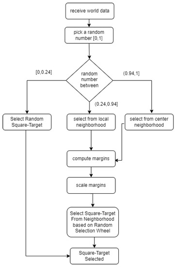 The most important part of the system is the agents’ ability of decision-making to select their next square-target. That is handled by a stochastic algorithm, partially inspired from the ant colony pheromone deposition [28] idea. The decision-making process is activated when an agent has completed a task and it needs to choose the next square-target as its task. To make its decision, it uses the world information provided by the central entity as a 2-D matrix, containing the probability and time of the last visit of all the square-targets of the grid. The decision-making process is depicted in Figure 6. The agent first decides if it will stay in its current neighborhood or travel to another neighborhood of the map. That decision is not deterministic, and the agent chooses its current neighborhood with a probability of 0.7, the center neighborhood with probability of 0.06 or a random square-target with probability of 0.24. The ability to travel across the map instead of staying in neighboring squares is added to force the agents to move around the map; this helps to escape local minima by exploring areas of the map that have not been explored recently or detect intruders during the flight and add more information to the world’s matrix. After the agent decides the neighborhood of its next square-target, it needs to select the exact square-target. It computes the margin of every square of the neighborhood based on the Equation (13):