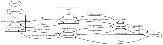 Figure 7 presents the overall system architecture of the implementation of a swarm containing two agents only for demonstration purposes. The figure has been produced from the rqt_graph ROS tool. The nodes are represented by eclipses, while the arrows connecting them represent the topics which they use to exchange messages. The gazebo and gazebo_gui nodes are related to the simulation and the simulation’s graphical user interface. The uav0/mavros and uav1/mavros nodes’ purpose is to transfer information between the ROS environment and the autopilot [37]. The MAVROS package [38] enables the data exchange between ROS nodes and autopilots equipped with the MAVLink communication protocol [39]. The nodes central_node, drone_node0 and drone_node1 were implemented by our team.