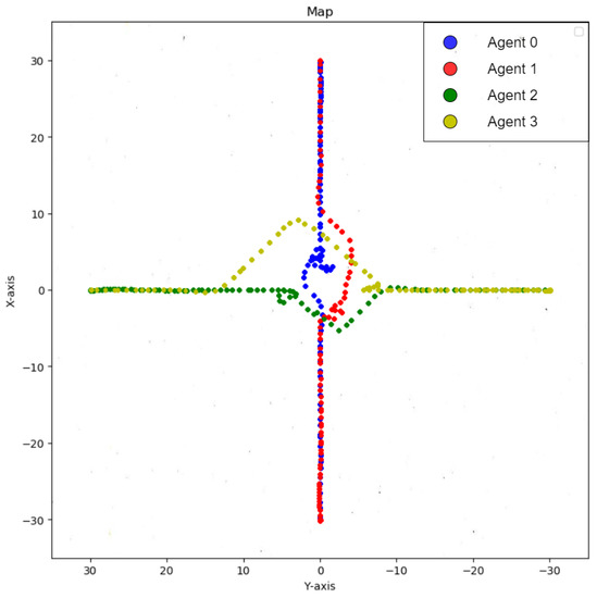 The overall desired velocity is expressed in the x, y axes as and for each agent i, and it is computed from Equations (20) and (21).