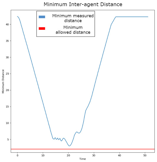 The most crucial block when dealing with swarms is to ensure that each agent can perform autonomously with safety. Hence, a collision avoidance algorithm is needed to ensure that the agents do not collide on each other. In the literature, a variety of methods exists with many different characteristics and capabilities. A potential field method [30] was selected both for guiding the agents to a point of interest and for preventing inter-agent collisions. The implemented collision avoidance method is decentralized and it requires for every agent to be aware of the position of the other agents in a distance shorter or equal to 7 m by utilizing V2V communication. The collision avoidance block is enabled only at the “Go to” and “Intruder following” modes. In the “Scan” mode, no conflicts occur, since only one agent could be in the “Scan” mode on a particular square-target at every moment. If two or more agents either in the “Go to” or in the “Intruder following” mode detect a collision in their path, they all act to ensure deconfliction. If one or more agents not in the “Scan” mode detect a possible collision with an agent in the “Scan” mode, the agents that are not in “Scan” mode deconflict while the scanning agent continues its route.