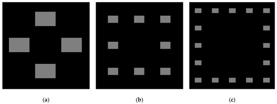 Figure 11. Positioning of the static cameras for scenarios 1, 2 and 3 accordingly at (a–c). The gray rectangles represent the field of view of the agents.