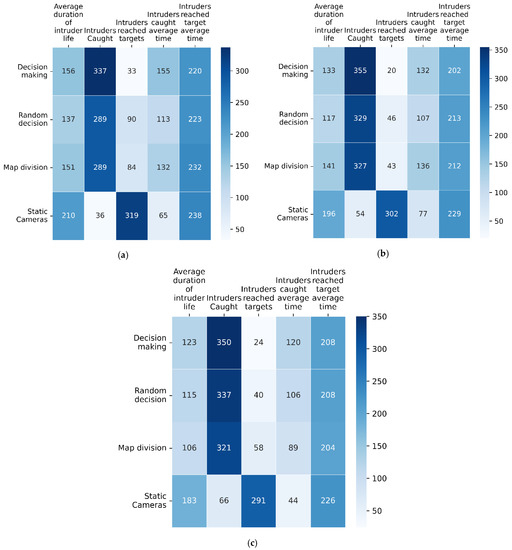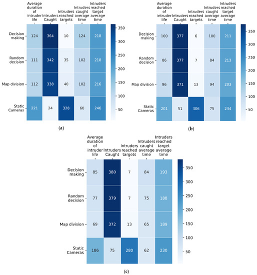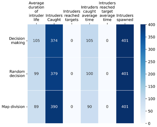 When 8 and 16 UAV agents are used, as shown in the second and third graphs of Figure 13, the benefits of decision making are clearer when compared to other approaches as the higher amount of squares per UAV agent allows for a significant chance of a random decision being wrong. When 8 UAVs are involved, 20 intruders reached their target using the decision-making algorithm, 46 for random decision, and 43 for map division, which performed once again roughly equally. Static cameras once more proved to be significantly worst in these tests, as 302 intruders reached their targets. The decision-making system caught 355 intruders, 26 more when compared to random decision and 28 more when compared to map division. The trend continues for 16 UAVs with decision making having a large lead, catching 350 intruders, and missing just 24 intruders. In this case, the random decision proved better than map division, as 40 intruders reached their goal and 337 were caught, while the results were 58 and 321, respectively, for map division. Map division underperforms, likely due to the inability of the system to migrate resources to hotspots.