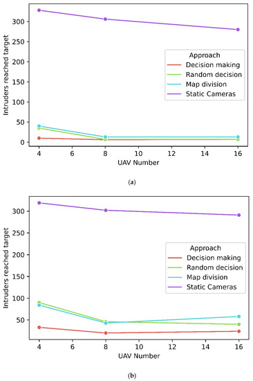 Figure 14 focuses on the number of intruders that reached the target for the different scenarios of each set. Plot (a) shows that the number of intruders to reach the target is relatively stable across the scenarios of set 1 and maintained in low values for the decision-making approach. That indicates that the system’s performance fits the specific density used in set 1 of one UAV agent per 25 square-targets. The random decision and map division approaches demonstrate similar results to the decision-making approach as the size of the swarm increases, indicating that the number of UAVs is enough for monitoring the given area, even for systems with no decision-making capabilities. Plot (b) presents the same metric for the second experimental set. In this case, the density of UAVs per square-target is lower and the advantage of using agents capable of decision-making is clearer, as the proposed decision-making approach outperforms the three competing approaches.