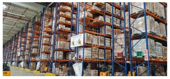 Storage (loading and unloading), order picking, unit load design, and labeling take place in the warehouse building. A double shelving system is used in the warehouse. Between the double shelves, there is a wide aisle where the drone can travel. A shelf system is divided into rows or compartments. One, two, or three spaces can be created in one compartment (see Figure 1). All units stored in these locations were identified with a QR code that contains all the important data for their management.