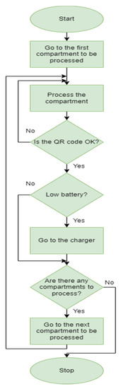 Moving along the aisle, the drone looks for the compartments and takes a photo of each compartment, which is sent to a pre-processing device (in our study, this was a high-capacity tablet) where the pre-processing application runs. During the pre-processing, the first test checked the quality of the image (in terms of brightness, sharpness, distracting factors). The drone did not change its position until the pre-processing application instructed it to do so. If the picture quality was not good enough, the pre-processing application took another picture with the drone. If the picture was good quality, the drone continued its journey. During the image processing, a proper QR code was being checked. If the QR code was appropriate, its content was read out. If successful, it sent the content of the QR code to the central application and set the processing status to ‘successful’. If it was not successful, it sets the bin’s processing status to ‘failed’. If a QR code was not found, an empty compartment comment was entered (of course, this does not mean that the compartment is empty in all cases; however, the central application decided whether it is empty or due to incorrect processing). In this case, it always sent the drone to the next compartment. Further processing always took place in the central application and depended solely on the capabilities of the central application. The description of the processes taking place here is beyond the scope of this study.