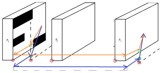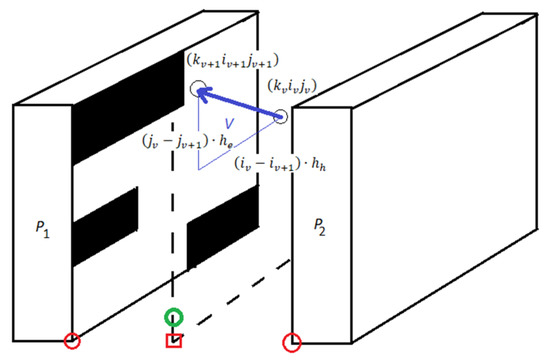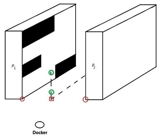 The shelf system to be tested. The black shelves indicate that the compartments that have already been examined. (The green circle indicates the processing starting point of the drone the red circles the reference points of the shelf systems (), the red square indicates the floor-level reference point of the aisles of two shelf systems, which is the same as (), but .).
