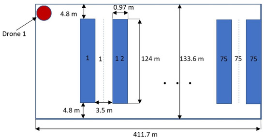 All drones took off at the same time. If this was not the case, but each drone started at a time different from the start time, then a time variable could be assigned to each drone, which shows the time elapsed from the start of the inventory to the start of the drone. By adding this to (see later), we obtained the time used by the given drone from the beginning of the inventory to the end of the processing. This does not affect the algorithm described below; in addition, this case occurs very rarely in practice, and due to the abovementioned reasons, this parameter can be omitted without restricting the generality.