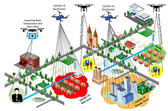 The aim of social distancing UAVs (centrally controlled by the police department) is to ensure that people maintain the required distance from those affected by the virus. It is equipped with either thermal or infrared and color image cameras. It first traces the human bodies and then calculates the distance between them. Distance could be either Euclidean distance or Manhattan distance, where X and Y are the location coordinates of two persons. If the distance is less than the threshold value , then an automatic announcement “maintain social distancing” can be made through the UAV.