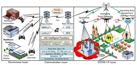 This section unfolds the functionality of the proposed scheme, i.e., a 6G-envisioned UAV scheme for social distancing, sanitizing, inspection, and monitoring of the COVID-19 pandemic. It is physically, as well as logically, divided into three connected layers: (i) governance, (ii) communication, and (iii) COVID-19 layers, as shown in Figure 3. The systematic elaboration of these layers is as follows.