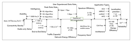 This layer is responsible for establishing the communication between the UAVs at the COVID-19 layer and the ground control stations at the governance layer. The following communication architecture employs 6G services that provide a vast spectrum and are well-suited for delay-sensitive applications. Various characteristics of 6G communication are as shown in Figure 4. The user-experienced data rate in 6G is ≈1 Gbps, which is almost ten times faster than 5G. The energy and spectrum efficiencies of 6G are 10–100 times and 5–10 times those of 5G, respectively [14]. Moreover, 6G allows the virtualization and slicing of networks through software-defined networking (SDN) and network function virtualization (NFV) of the physical and medium access control (MAC) sub-layer. To achieve the same, ML/DL techniques are employed to train the network for resource intelligence and form informed decisions on the trained network models. Thus, virtualization in 6G will prove to be the key enabler of a highly digitized society, where everything is autonomous and connected.