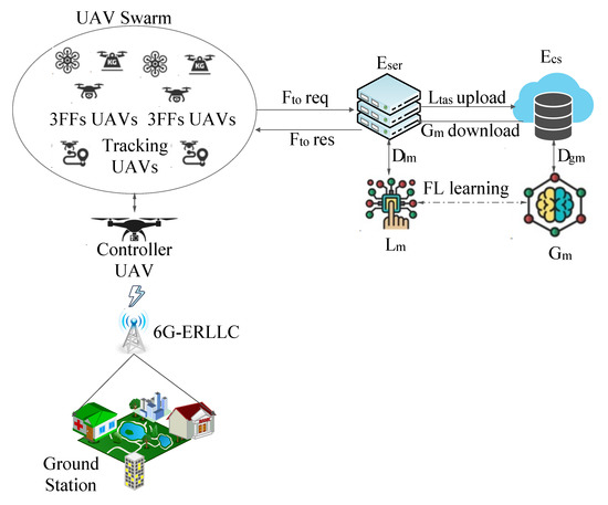 To perform 3FFs via 6G-ERLLC channels, a UAV swarm network (groups of UAVs with controller UAV for path formation, route control, and UAV maintenance) is required. For consistent monitoring purposes, high-end computational requirements are required in UAV networks. However, as UAV nodes are battery-operated, limited resources are possible at swarm networks [19]. In such cases, task offloading by UAVs to the nearby edge servers for running artificial intelligence (AI) models is performed. The nodes are distributed, thus federated learning (FL) becomes a good option, where UAV-collected data can be trained by local models, which update the global model gradients [20]. The AI models run mundane monitoring tasks, coupled with route selection and topology and mobility formation, which is communicated to ground nodes via the 6G-ERLLC channels. The data-intrinsic computation and classification become an important part of the study for effective 3FFs realization. Moreover, for massive sanitization purposes, specially designed hexacopter and octocopter drones are suitable, owing to their property of carrying heavy payloads. The details are presented in the next sections.