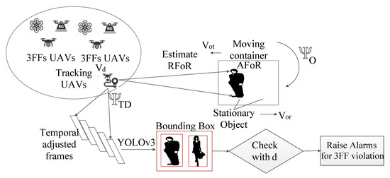 - Non-stationary frames—To effectively realize the 3FFs, we assumed that persons (objects under consideration for thermal inspection, or social distancing) might be present in a moving frame-of-reference (FoR). For the persons, they are stationary, but for UAVs (outside the moving FoR), the motion is relative. Thus, the persons are moving, and we require a geo-fencing operation to locate the person in a moving FoR. In this case, we divide our FoR into coordinate frames (North, South, West, and East) and find the relative location of a person in the coordinate frame through a GPS tracker (which is installed in the personal application). We form a revised bounding-box estimation based on moving FoR to form the position estimate.