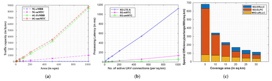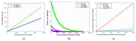 Figure 8a shows the improved UAV mobility of 6G-ERLLC, which is ≈1000 km/h in the best case, over the 5G mobility of 550 km/h. Figure 8b shows the radio loss of 6G-based antennas that communicate with UAVs inside a spatial range. As 6G spectrum efficiency is ≈5–10 times better than 5G channels, and the path loss is minimized, resulting in an improved lifetime of UAV communications. The user-experienced (UE) data rate of 6G channels is 1 Gbps, compared with 100 Mbps in 5G, and 10 Mbps in 4G, as shown in Figure 8c. Moreover, a connection density of 6G is ≈10 devices/km2, which is ten times that of 5G. Thus, as more devices are added to 6G ecosystems, the UE data rates do not drop drastically, resulting in a better experience for 6G users. This is useful for UAVs, as they have to send ultra-HD high-resolution images of infected COVID-19 hotspots to GS.