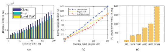 For local execution, we follow the approach as presented by authors in [58]. Figure 9a presents a comparative analysis of response time when task size varies. As more UAVs send data in batches, the task size increases, and thus the local execution shifts to edge execution, which shifts to cloud execution. Thus, offloading time is added to the response time, which is evident from the figure. As an example, for a task size of 100 MB, the cloud execution time is 8634 ms, edge execution time is 6789 ms, and local UAV execution is 6011 ms. Thus, at the edge, an offloading time of 778 ms is added, and from to , the additional time of 1845 ms is recorded. The time between edge–cloud becomes further intensified owing to the FL gradient computation and parameter communication. Thus, to address this challenge, a future scope might include optimal control over FL accuracy vs. the response time to edge nodes.