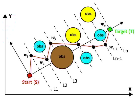 In robotics, the path planning procedure consists of guiding the unmanned vehicle from a starting point to a destination point in the coordinate system XOY, as shown in Figure 1. The X-axis range that connects these two points is divided into equal subsegments denoted as . To carry out this navigation mission, two key tasks must be determined, namely the 3D environment modeling (waypoints, obstacles, flyable paths, etc.) and the planning problem often formulated as a constrained multiobjective optimization problem [,,,].