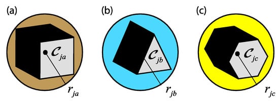 where the terms , , and can be computed using the same Formulas (11)–(13) but by replacing the radius with and the center coordinates with those of the defined virtual sphere .