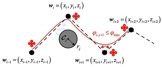 The consideration of the dynamic characteristics of UAVs is another essential objective [,,]. The straighter the UAV drone’s flyable path, the more the control system complexity and fuel cost of the flight process decrease. However, in a real-world situation, a UAV should arbitrarily change its direction around waypoints and moving obstacles. Therefore, the candidate flyable path will present curvatures at any direction change and sharp corners. To handle such dynamic constraints of UAVs, the idea to use the concepts of steering angle and the corresponding turning radius was considered [,]. Such turning angles define the angles between two adjacent segments along the generated sequence of flyable waypoints, as depicted in Figure 3. The steering angle is then introduced to limit the straightness of the path and constrain the motion of the vehicle. Considering this dynamic behavior around waypoints, a second objective function that models such planning dynamic constraints can be chosen as follows []: