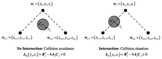 When the discriminant of such a second-order equation is negative, there are no intersections between the line connecting two consecutive drones’ positions and the moving obstacle modeled as a sphere. Such an operational constraint is defined as follows: