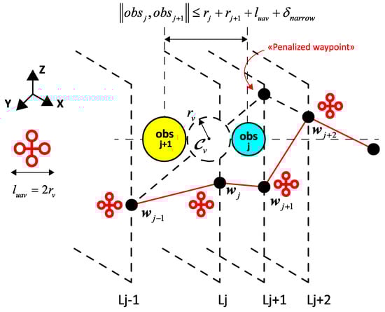 So, novel collision-free constraints of the same type as (14) can be defined by considering the intersection avoidance of the planned path segments with such virtual spheres, i.e., circumscribed to the narrow zone between obstacles. The waypoint assumed was generated when the drone passing between two nearby obstacles should be panelized. The UAV thus changes direction along the Z-axis, i.e., can fly above these obstacles or below them while respecting the safe distance from a possible collision with the ground. Another tolerated, feasible move consists of targeting the new waypoint of the next hyperplane, i.e., changing the direction along the Y-axis with a constant altitude, as depicted in Figure 5. From the optimization point of view, such a constraint for path planning regarding narrow passes between moving obstacles can be modeled as follows: