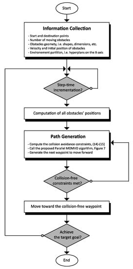 Obstacle collision avoidance is fundamental within any dynamic path planning problem with UAVs. Based on the assumptions that the number, initial positions, and range of velocity of the moving obstacles are known, the proposed UAV path planning strategy consists of determining appropriate collision-free waypoint sequences in 3D environments with moving threats. Allowing for safe navigation from a starting point to a destination station, the designed path planning technique is based on the first step of the collection of the environment’s information, i.e., start and target points, number and dimension of moving obstacles, initial positions of obstacles, etc. As shown in the flowchart of Figure 6, the modeling of the 3D flight environment regarding the workspace partition, UAV dynamic constraints, and the geometry of moving obstacles should be investigated. At each increment of the computation time, the generation of collision-free waypoints is then performed using the proposed parallel processing PMOMVO planner (see the corresponding Algorithm 2 and the flowchart of Figure 6). Such an improved PMOMVO algorithm, associated with a TOPSIS type of multicriteria decision-making approach, aims to increase the performance of the dynamic planner in terms of computation time and trapping avoidance in local minima. A geometric technique to formulate moving obstacle avoidance is proposed based on the intersection of the segments connecting the generated waypoints with any obstacle assumed to be circumscribed in a 3D sphere with known centers and radii, as illustrated in Figure 4 and Figure 5. The generated collision-free waypoints are then targeted by the UAV drone while respecting the defined dynamic constraints, i.e., steering angles, straightness limitation, and narrow passage constraints, as shown in Figure 3, Figure 4 and Figure 5.