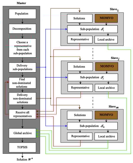 In this paper, a master–slave model is proposed for the MOMVO algorithm parallelization as shown in Figure 7. In this proposed shared memory model, one of the CPU cores is selected as the master and the other ones are defined as the slaves [].