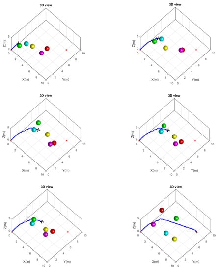 In dynamic environments, avoiding collision with moving obstacles is more complex and harder than in the case of static ones. Indeed, the drone must be able to coordinate its movement by avoiding any possible collision with a set of obstacles evolving in the navigation environment with position and speed variables in time []. In a real-world navigation environment, the geometric coordinates of dynamic obstacles are difficult to define. The main characteristics of obstacles, such as the center, the radius, the initial position, and the motion speed, are assumed to be known at the start of the planning process. At each time step, the position and speed motion equations of the jth given dynamic obstacle are updated as follows: