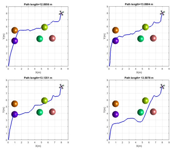 In addition, another type of collision situation can occur in the case of narrow passage between two moving obstacles located at the same altitude. In this case, i.e., generation of no feasible waypoint between two obstacles’ positions, the distance separating such two circumscribed spheres is insufficient to make a safe flight of the drone regarding its geometric dimensions. In such particular planning scenarios, a virtual sphere of radius and centered midway between two nearby obstacles is considered, as shown in Figure 5, where denotes the vehicle’s length and is a predefined safety distance of a narrow pass.
