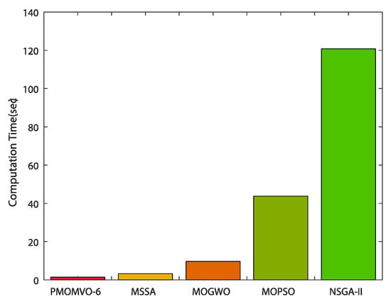On the other hand, in order to further show the superiority of the proposed parallel PMOMVO algorithm, a comparative study of the computation times was carried out, as depicted in Figure 15. Other extensively used multiobjective optimization algorithms, namely the salp swarm algorithm (MSSA) [], grey wolf optimizer (MOGWO) [], nondominated sorting genetic algorithm II (NSGA-II) [], and particle swarm optimization (MOPSO) [] were considered for such a comparison. Retained as the most powerful variant of the PMOMVO algorithm in terms of computation time, the PMOMVO-6 optimizer largely outperformed all reported MSSA, MOGWO, MOPSO, and NSGA-II algorithms.