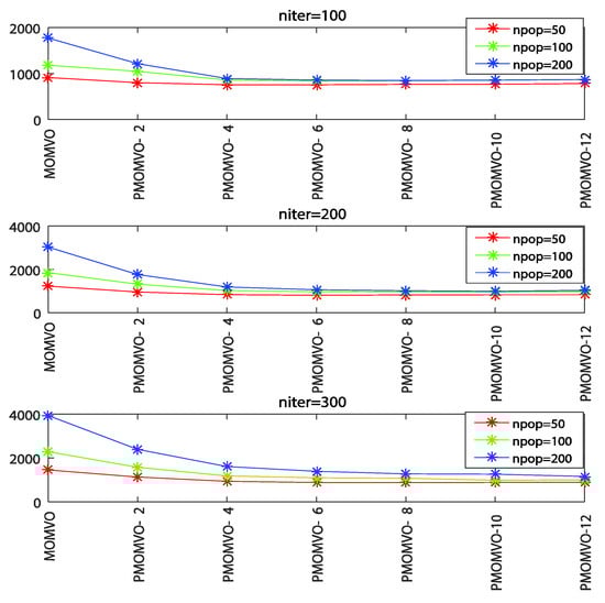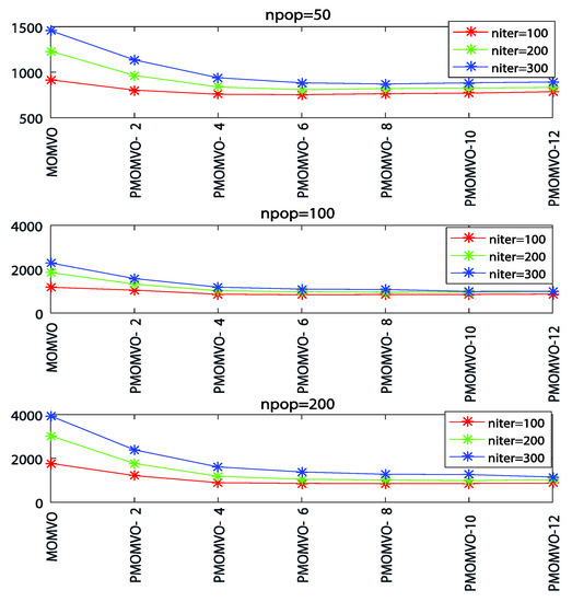 Figure 8 illustrates the set of Pareto solutions obtained by the MOMVO and PMOMVO algorithms corresponding to the mean case of the optimization. Looking at these results, one can observe the large gaps in the topology distribution of Pareto fronts for the low values of the sharing rates ,, and . However, for the high solution sharing rate , the distribution of the nondominated solutions along the compromise surface is more uniform. According to these demonstrative results, the number of times that slaves share information with each other clearly influences the uniformity of the obtained Pareto front. The higher the value, the more the distribution of Pareto solutions approximates a uniform distribution. In addition, the performance of the PMOMVO variants, especially those with the highest number of slaves, surpasses the standard MOMVO in terms of solution distribution uniformity.