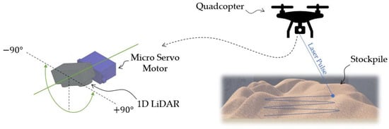 A low-cost, yet accurate approach for stockpile volume estimation within confined storage spaces is presented. The novel approach relies on actuating a single-point light detecting and ranging (1D LiDAR) sensor using a micro servo motor onboard a drone. The collected LiDAR ranges are converted to a point cloud that allows the reconstruction of 3D stockpiles, hence calculating the volume under the reconstructed surface. The proposed approach was assessed via simulations of a wide range of mission operating conditions while mapping two different stockpile shapes within the Webots robotic simulator. The influences from modulating the drone flight trajectory, servo motion waveform, flight speed, and yawing speed on the mapping performance were all investigated. For simple rectangular trajectories, it was found that having longer trajectories that are adjacent to the storage walls provides best reconstruction results with reasonable energy consumption. On the other hand, for short rectangular trajectories within the storage middle space, the yawing speed at corners must be decreased to ensure good reconstruction quality, although this can lead to relatively high energy consumption. Comparing the volumetric error values, the average error from the proposed 1D LiDAR system, when operating at 6°·s−1 maximum yawing speed at the corners, was 0.8 ± 1.1%, as opposed to 1.8 ± 1.7%, and 0.9 ± 1.0% from the 2D and 3D LiDAR options, respectively. Moreover, compared to 2D and 3D LiDARs, the proposed system requires less scanning speed for data acquisition, is much lighter, and allows a substantial reduction in cost.