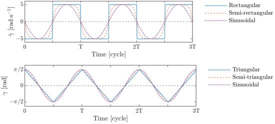 where and are the servo motor instantaneous angle and angular velocity, respectively; is the angle amplitude set here to ; is a parameter that controls the shape of the waveform and can vary between zero (sinusoidal waveform) to unity (triangular waveform for angle); is the frequency; and t is the time. Figure 2 shows how the proposed variation provides a suitable means to control the shape of the waveform for both angular velocity and position.